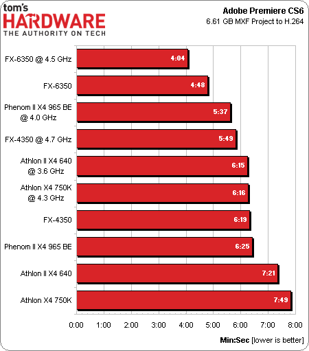 The Athlon X4 750K is also impressive, right up until it falls flat in Premiere Pro. Overclocking and tweaking helps tremendously, allowing the inexpensive CPU to match the stock FX-4350. We thought it might be starved for memory bandwidth in stock form, but later debunked this theory by dropping the memory data rate to 1600 MT/s with a 4.3 GHz overclock. This only added three seconds back to the timer.