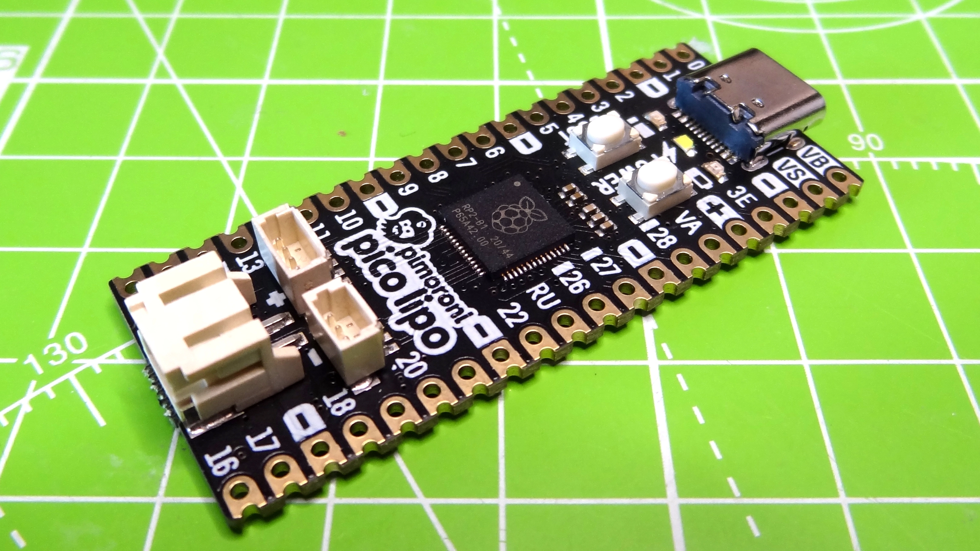 The Raspberry Pi Pico form factor, a DIP package, is at home in a breadboard, protoboard or surface mount soldered into your project, and Pimoroni’s $17 Pico LiPo shares that same form factor but adds many more features. The board is three times the price of a typical Raspberry Pi Pico, but that extra money is well spent as it provides a drop in replacement for an existing Pico project with added features such as battery charging, a USB-C port, 16MB of Flash memory and a Stemma QT / Qwiic connector. All of these extras make this board a joy to use. And use it we did!