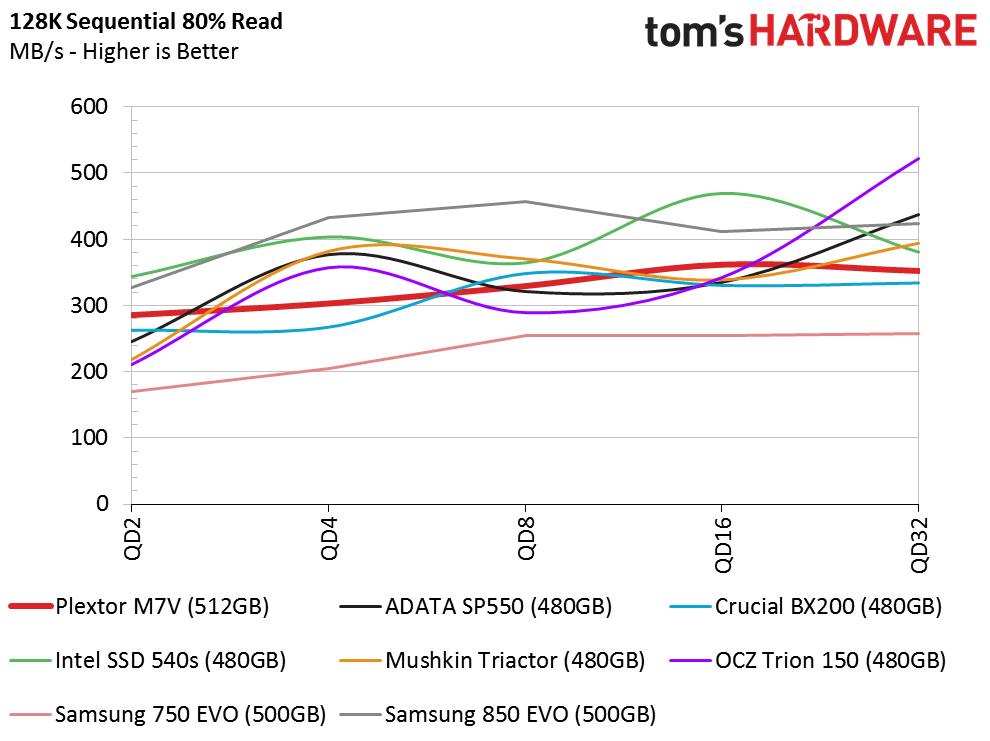 The Plextor M7V 512GB SSD suffers from low-to-average sequential read performance, and that carries over to the sequential mixed workload test. Most of the other TLC-based products, including the M7V, have trouble with performance scaling as the workload intensifies.
