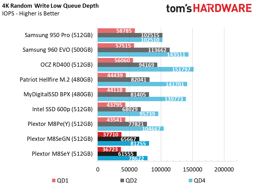 True to the specification sheet, the M8Se 512GB provides higher performance than the 1TB model. Both capacities knock on the 10,000 IOPS door at QD1. That's more than nearly all SATA SSDs, but unfortunately, the Plextor didn’t price the M8Se like a modern SATA SSD.