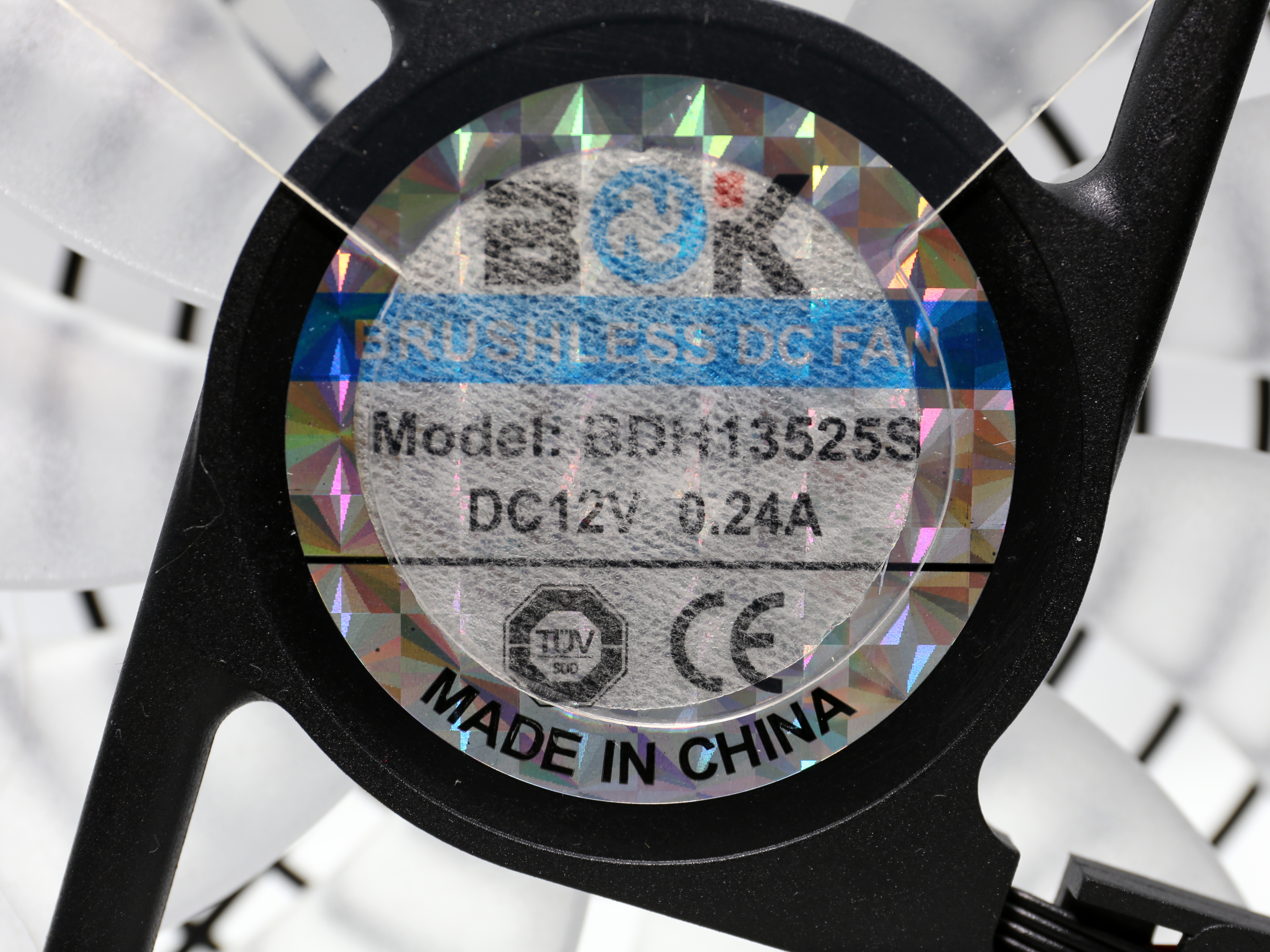 | Fan Model | BaoDiKai BDH13525S (135mm, 12V, 0.24A, sleeve bearing) |