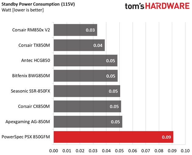 In the following tests, we measure the PSX 850GFM's efficiency at loads significantly lower than 10 percent of its maximum capacity (the lowest load the 80 PLUS standard measures). The loads we dial are 20, 40, 60, and 80W. This is important for representing when a PC is idle, with power-saving features turned on.