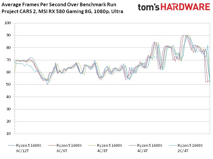 We've already seen that Project CARS 2 doesn't split work across host processing resources particularly evenly. One of our Ryzen CPU's cores is overloaded while the others, physical and logical alike, don't do as much. Let's see what happens when we toy with core and thread count. For this experiment, we standardize on a single graphics card: AMD's Radeon RX 580.