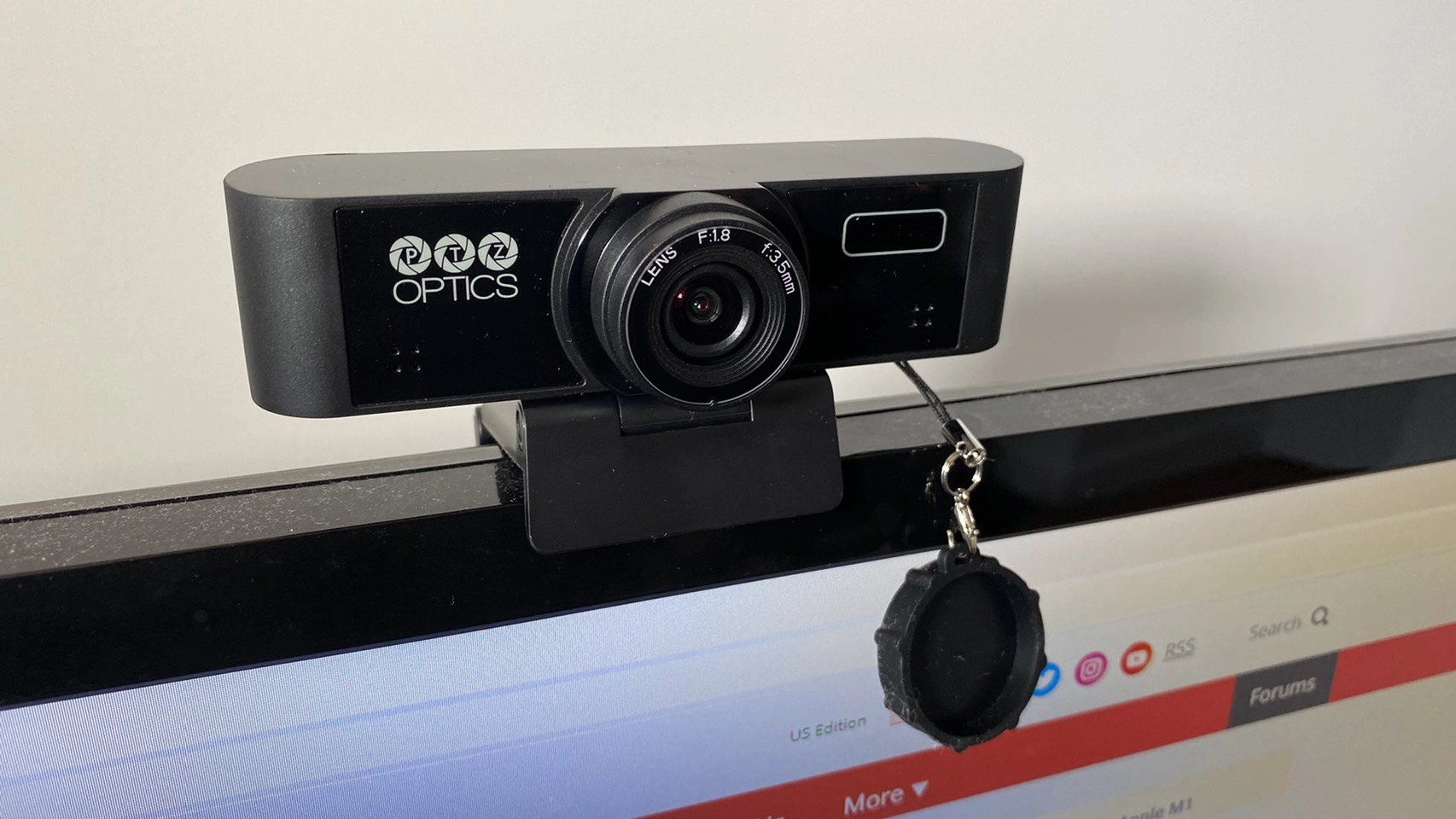 It attaches to your monitor via an arm with a tripod slot in the bottom, and you can tilt it downwards but not upwards. It also can’t rotate, though it does come with an attached cover for the camera. That’s convenient, but given that most webcams also have lights that indicate when they’re recording (the PTZ Optics webcam has one of these as well), it’s not absolutely necessary.