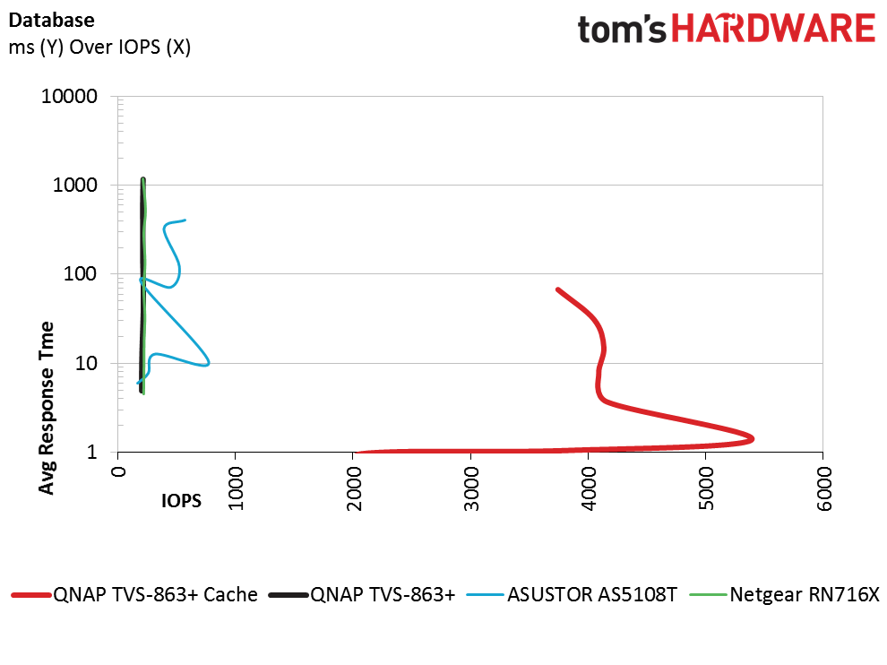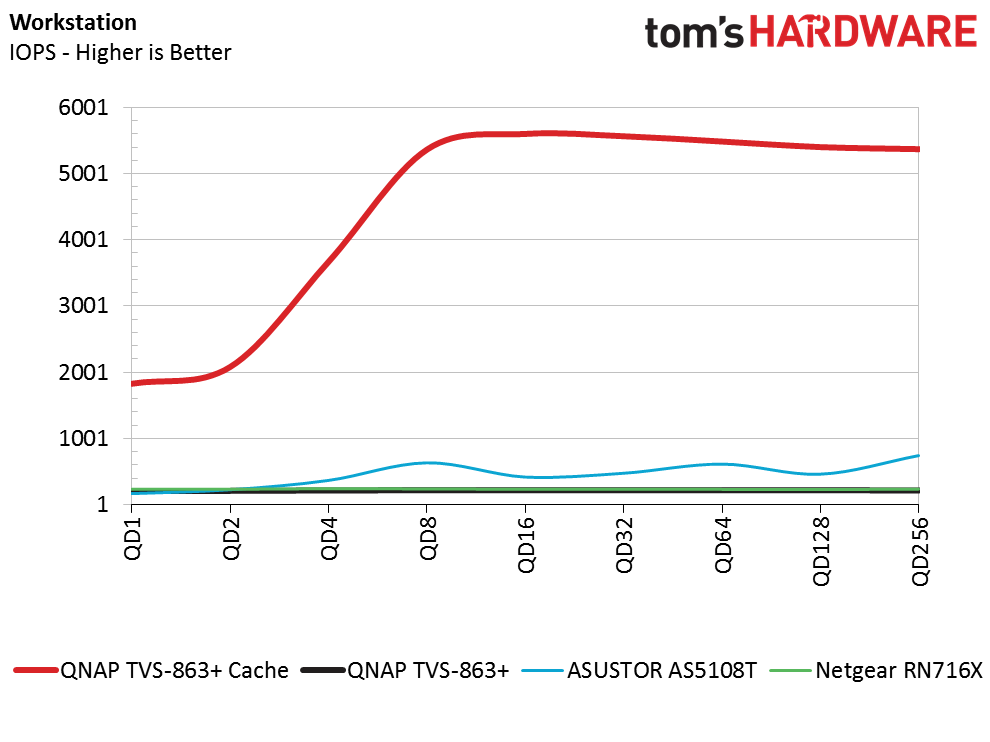 In many of the workloads we found very little performance scaling as the queue depth increased with the TVS-863+ without cache. The Netgear ReadyNAS 716X delivered the same flat-line results and the ASUSTOR AS5108T showed a little variation. With the SSD cache enabled, the TVS-863+ picked up the pace quite a bit and manage to increase performance until reaching peak. After the peak performance the IOPS drops due to the latency increasing for each additional IO.