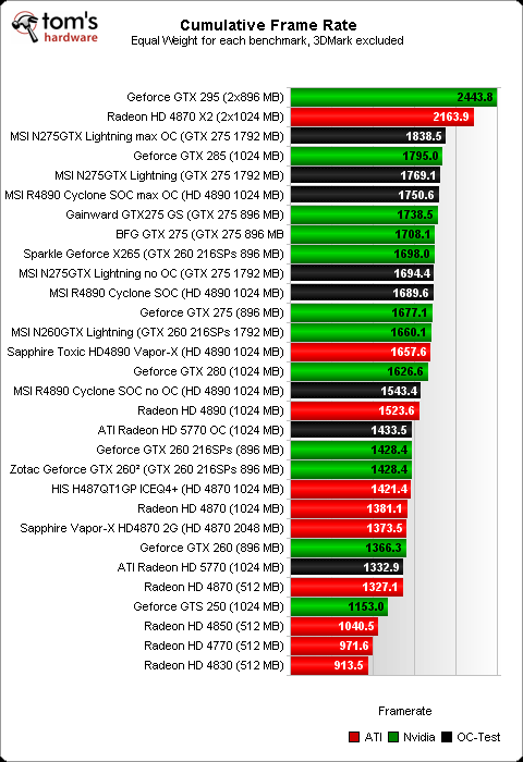 This chart simply combines the results from our various benchmarks into an aggregate score, basically a cumulative frame rate measured in fps. The 3DMark06 score is not included in this result.