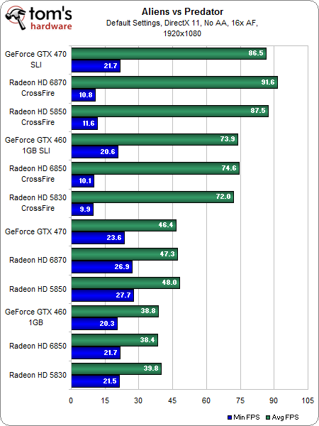 We chose Aliens vs. Predator as a showcase for CrossFire and SLI performance because the average frame rates scaled closely to the aggregate average performance we saw in our CrossFire vs SLI scaling analysis article. The dual-card performance doesn't provide any surprises, although we do see the low minimum frame rates with CrossFire that we experienced in the scaling analysis article.