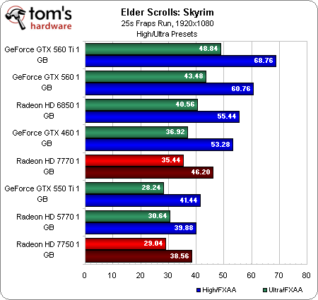 The Radeon HD 7770 easily beats Nvidia’s GeForce GTX 550 Ti, but comes in behind the 256-bit GeForce GTX 460 1 GB, which in turn slightly trails the Radeon HD 6850. Meanwhile, the Radeon HD 7750 pretty much matches pace with AMD’s old (but still quite capable) Radeon HD 5770, itself losing to the GeForce GTX 550 Ti under High details and then passing it at Ultra quality settings.