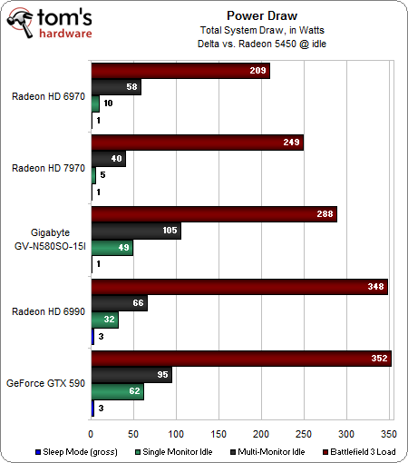 Surprisingly, the 7970 draws less load power than a GeForce GTX 580, while pulling less at idle than a Radeon HD 6970. AMD’s power management advancements should pay dividends amongst our European audience, which has to pay significantly more for electricity than the North American readers.