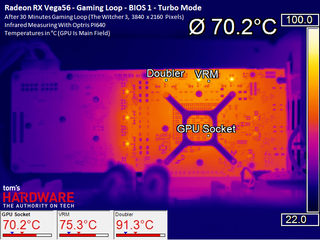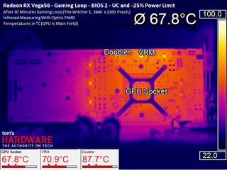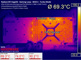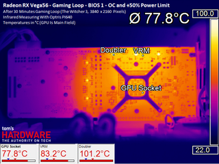 At maximum load, the HBM2 averages up to an additional 6°C on top of the GPU temperature in question. Our overclocking efforts pushed it beyond the 90°C mark, leaving us a little nervous.