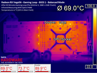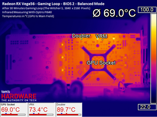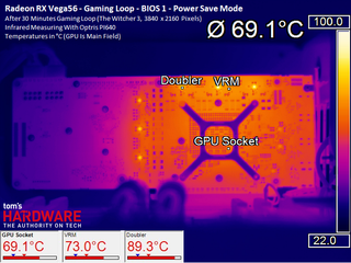For each of the two BIOSes, we provide thermal images for all three driver-based profile settings. These show how the card’s power consumption and fan speed affects the temperatures of various on-board components.