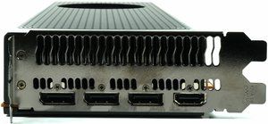 The end of the card is closed and includes mounting holes that are a common sight on workstation graphics cards. The powder-coated matte black slot bracket is home to three DisplayPort connectors and one HDMI 2.0 output. There is no DVI interface, which was a smart choice since it allows for much better airflow. The slot bracket doubles as the exhaust vent, after all.
