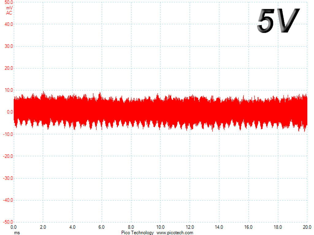 The following oscilloscope screenshots illustrate the AC ripple and noise registered on the main rails (+12V, 5V, 3.3V and 5VSB). The bigger the fluctuations on the screen, the bigger the ripple/noise. We set 0.01V/Div (each vertical division/box equals 0.01V) as the standard for all measurements.