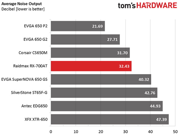 Under light and moderate loads, and under normal operating temperatures, the RX-700AT is silent. However, its fan profile could be much more relaxed given such high efficiency and modest thermal loads.