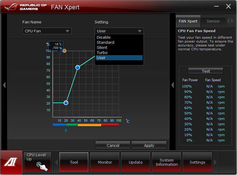 Asus Fan Xpert lets users set a custom fan speed curve based on component temperatures.