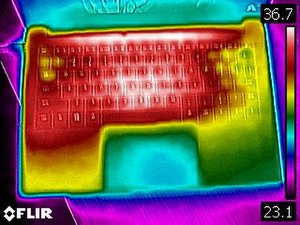 After streaming a 15 minute HD video from YouTube, the center of the keyboard between the G and H keys got hotter than expected at 36 degrees Celsius (96.8 degrees Fahrenheit), and the touchpad remained cool at 84.9 degrees Celsius. But the hottest spot was the bottom, which got toasty at 38.2 degrees Celsius (100.7 degrees Fahrenheit).