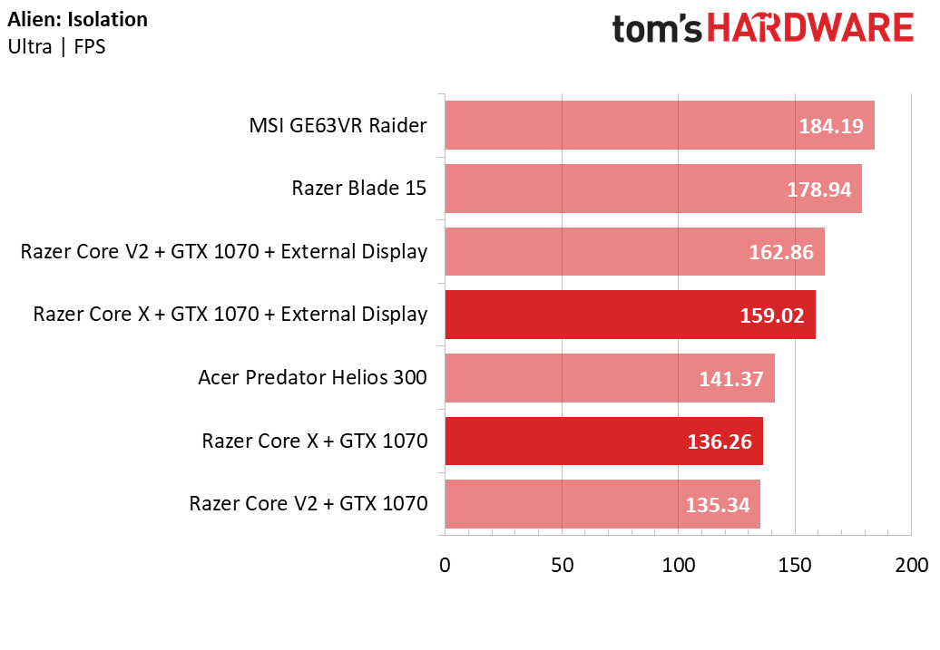 Alien: Isolation is easy to run, so any gaming system with adequate GPU power can achieve well over 60 frames per second. With the Core X and an external display, the Blade Stealth delivers close to 160 fps. But it experiences a 14 percent drop in performance without an external display, pulling the the Core X/Blade Stealth just below the Acer Predator Helios 300, which has a weaker GTX 1060. If your external monitor has a high refresh rate, that’s all the more reason to use it over your laptop’s internal display.