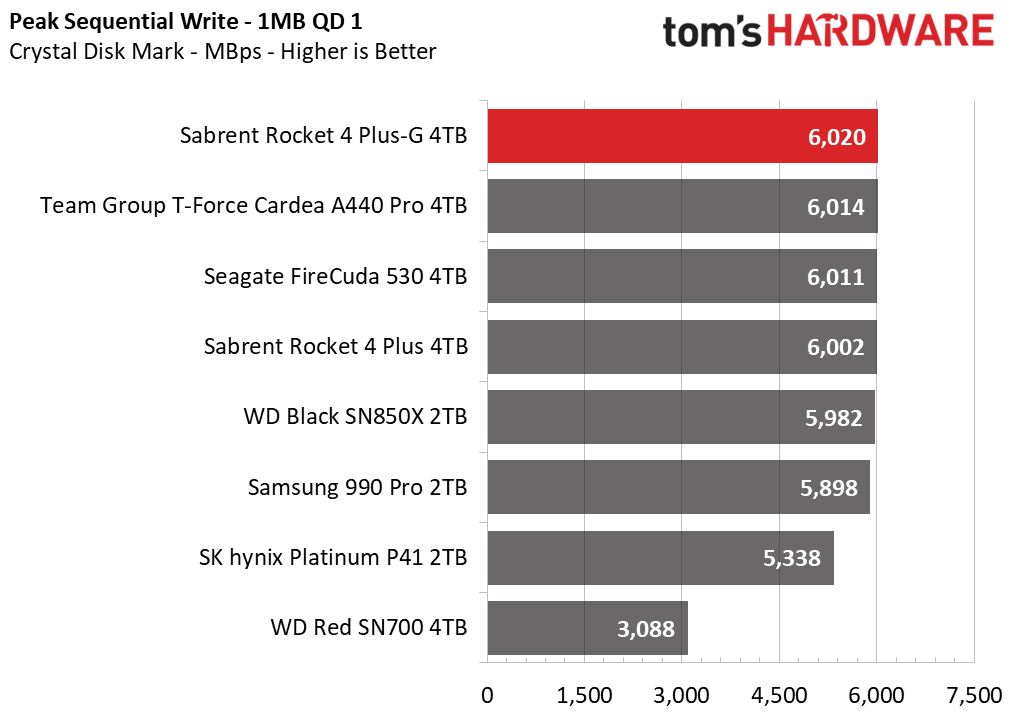The Rocket 4 Plus-G is consistently performant in ATTO. Sequential results in CrystalDiskMark are similarly consistent with high performance. That applies to all but low queue depth read workloads — the Platinum P41 and Black SN850X edge out the drive in that particular test. 4K low queue depth performance is excellent with only the 990 Pro being significantly faster during read workloads. These results also show general improvements compared to a last-generation drive like the Red SN700.