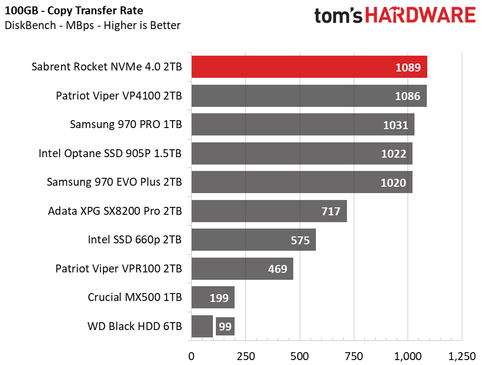 When it comes to moving around moderate-sized folders, the Sabrent Rocket NVMe 4.0 shows great performance. As well, it earns top ranks in the 100GB transfer and various large file read tests.
