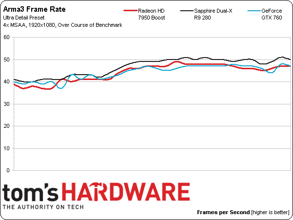 Not really. It is almost as though the Radeon 7950 Boost, R9 280, and GeForce GTX 760 were designed to deliver extremely close performance in the benchmarks we picked.