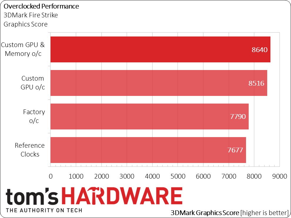 The card's GPU operates at 928MHz, representing a 10MHz overclock that makes a slight difference compared to the reference model. Once we increased the power target to its maximum 20% limit, though, we were able to push the core another 102MHz to to 1030MHz, yielding a 15% bump. As you can see from the 3DMark graphics scores, this had a significant impact on performance.
