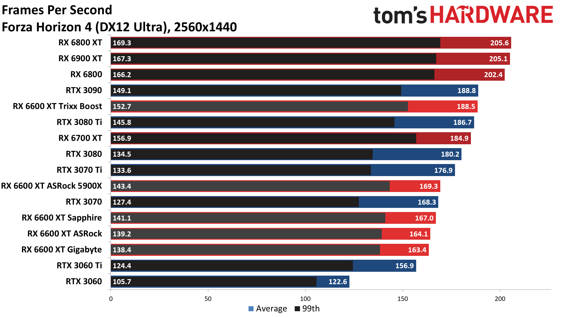 The results at 1440p are again super close. This time, however, we've got Trixx Boost enabled. That improved performance by 24% on average, though a few games showed smaller or larger gains. Red Dead Redemption 2 was the outlier, with 52% higher performance. It's not clear if the card was running out of memory, or memory bandwidth (maybe both), but the lower resolution clearly helped a lot. Forza Horizon 4 showed the lowest gain of 13% because it was already hitting CPU limits. Everything else landed in the 20–32% range of improvement.