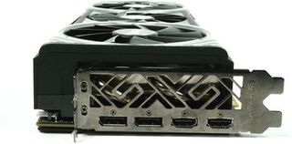 At the other end, a slot bracket hosts two DisplayPort 1.4-ready outputs and two HDMI 2.0 connector. There is no DVI-I connectivity, leaving more room for ventilation. Unfortunately, the way Sapphire positioned its heat sink fins, there is no real flow out the back. Instead, heated air exhausts down, toward your motherboard, and up, back into your case.