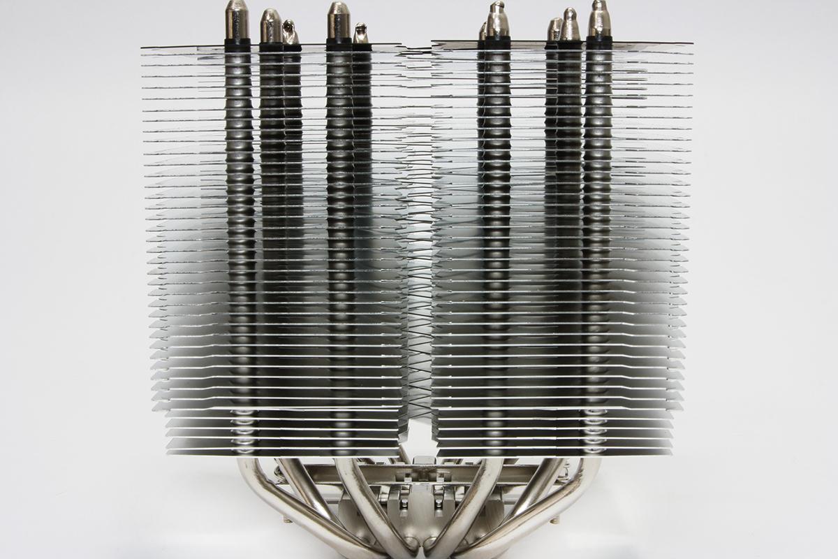 The Scythe Ninja 5 features six, nickel-plated heatpipes that run vertically through the entirety of its 41 interleaved aluminum cooling fins, which can be seen overlapping through the center of the stack. The base of the cooler integrates a broadly-grooved, mini-heatsink that integrates with the mounting arm of the cooler. Each of the six heatpipes are symmetrically aligned and offset to allow linear airflow around them.