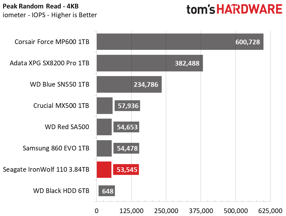 Today, we pit the Seagate IronWolf 110 NAS SSD against its arch-nemesis, the WD Red SA500, also at a 4TB capacity. As well, we threw in some other SATA contenders including the Samsung 860 EVO, Crucial MX500, and a WD Black HDD. Additionally, we’ve included the Adata XPG SX8200 Pro, one of our favorite M.2 NVMe SSDs, as well as a WD Blue SN550 and a speedy PCIe Gen4 SSD, the Corsair Force MP600 for good measure. Those last two drives are also M.2, rather than the SATA drives' 2.5-inch form factor.