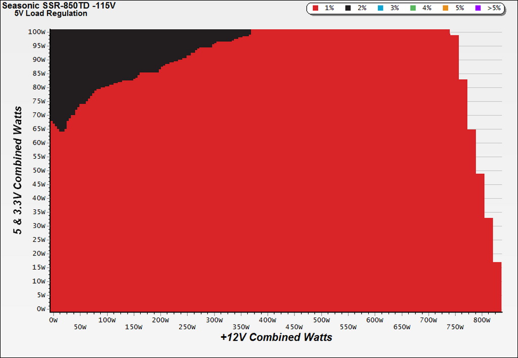 To generate the following charts, we set our loaders to auto mode through our custom-made software before trying more than 25,000 possible load combinations with the +12V, 5V, and 3.3V rails. The load regulation deviations in each of the charts below were calculated by taking the nominal values of the rails (12V, 5V, and 3.3V) as point zero.