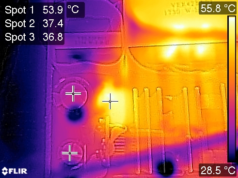 We applied half-load for 10 minutes with the PSU's top cover and cooling fan removed before taking photos with our modified FLIR E4 camera that delivers 320x240 IR resolution (76,800 pixels).