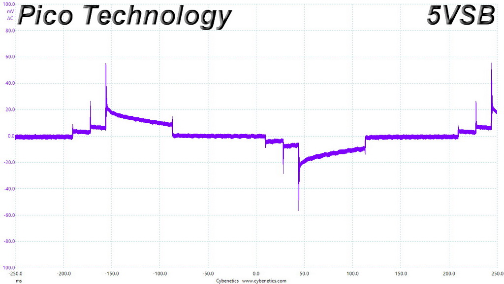 We observe a tiny voltage overshoot at 5VSB and almost perfect slopes at +12V. Our turn-on transient tests reveal very good performance.