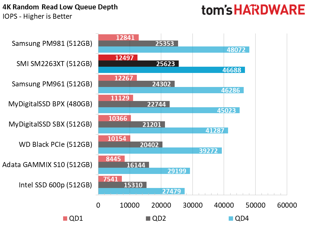 I bet you didn't see that coming. The SM2263XT outperforms all the other drives in this comparison at a queue depth (QD) of 1.