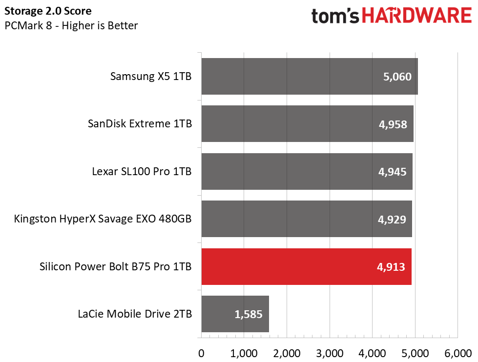 In PCMark 8, Silicon Power’s Bolt B75 Pro wasn’t able to surpass the HyperX Savage EXO. But still, it proved itself to be quite fast for application use. With a total score of 4,913 points and an average bandwidth of 195 MBps, it ranks fifth overall and is significantly better than what any HDD could deliver.