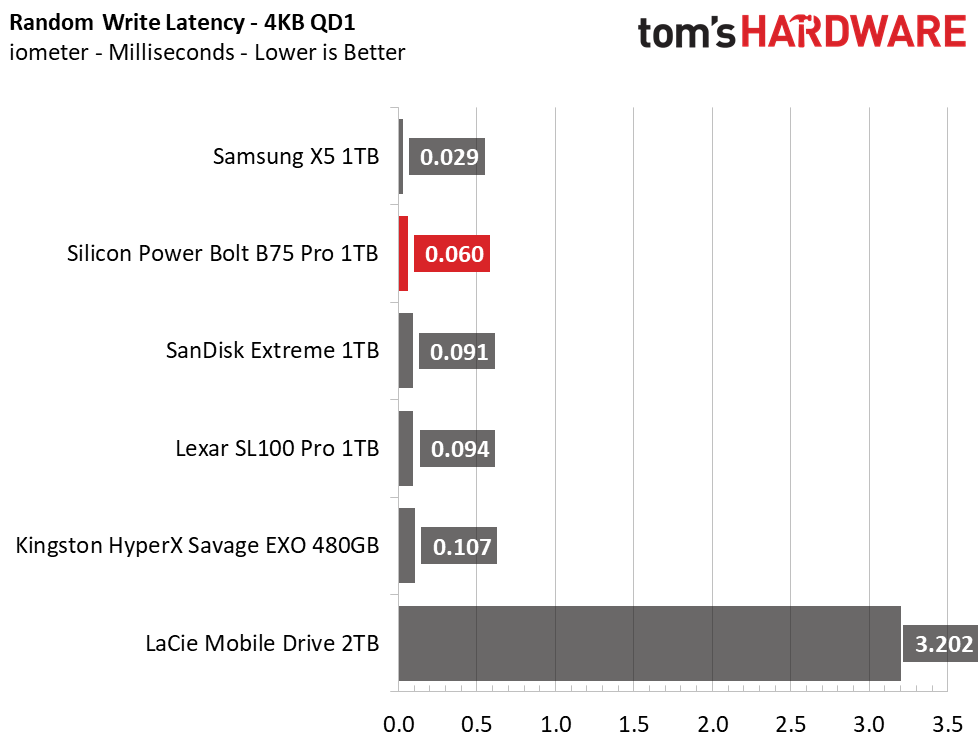 Results from sequential performance testing in iometer match that of ATTO. Speeds of 560/510 MBps read/write were achieved. With a fourth-place ranking, random performance is pretty decent too. At a queue depth of one, Silicon Power’s Bolt B75 Pro is capable of up to 4,300 IOPS read performance and has the second-highest write performance, 16,500 IOPS. Also, peak random figures come in at 22,000 / 39,000 IOPS read/write.