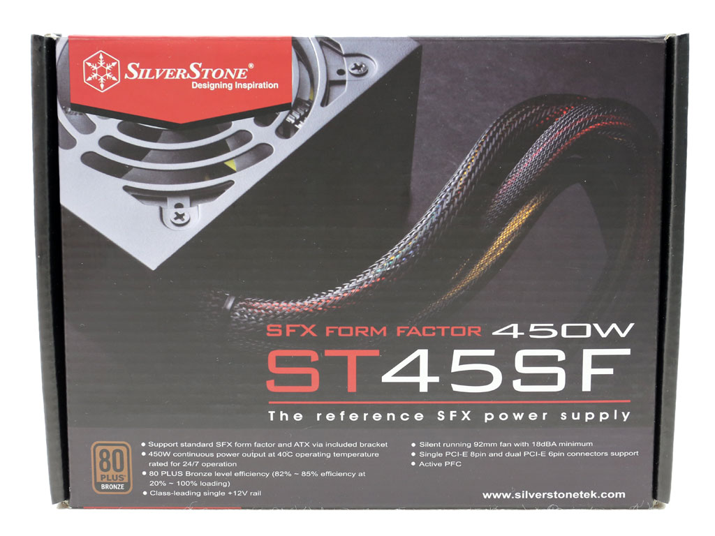 SilverStone's box is tiny, since it contains a compact SFX-based power supply. Up front, there's a photo showing the native cables, which are thankfully sleeved all the way up to the PSU's chassis. The model number is printed in large letters, and the SFX form factor is highlighted as well.