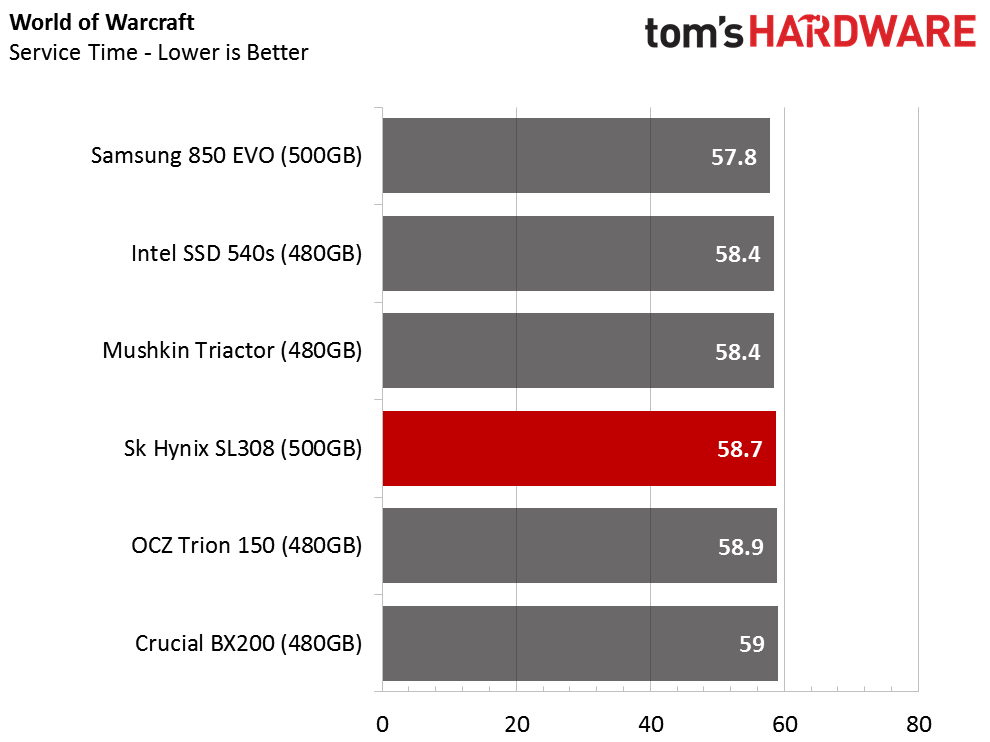 We've already mentioned the SL308's great flash management, but the PCMark 8 Advanced access time measurement drives our point home. Under the duress of taxing workloads, SK hynix's SL308 outperforms all of the other drives. This is a rarity from TLC-based storage.