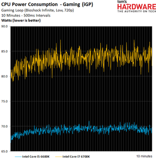 The Core i5-6600K remains relatively frugal with an average of 73W, whereas the i7-6700K helps itself to a full 100W (a 27W delta). Even though the i7 is Hyper-Threaded, allowing it to be better-utilized, with an average clock rate that's 300MHz higher, our measurement just isn't really acceptable, particularly since it's 5W over the CPU's claimed TDP.