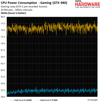 The combination of GeForce GTX 980 and Core i5-6600K yields an average power consumption of 53W. This is comparable to what we measured for the i7-5775C a couple of months ago. Surprisingly, Intel’s Core i7-6700K comes in 23W above this number, landing at 76W. Our i5-6600K test sample might be great, or our i7-6700K particularly bad, depending on how you want to look at it. At the very least, it demonstrates the variability between CPUs in the same family, though we also have to keep in mind that these are engineering samples.