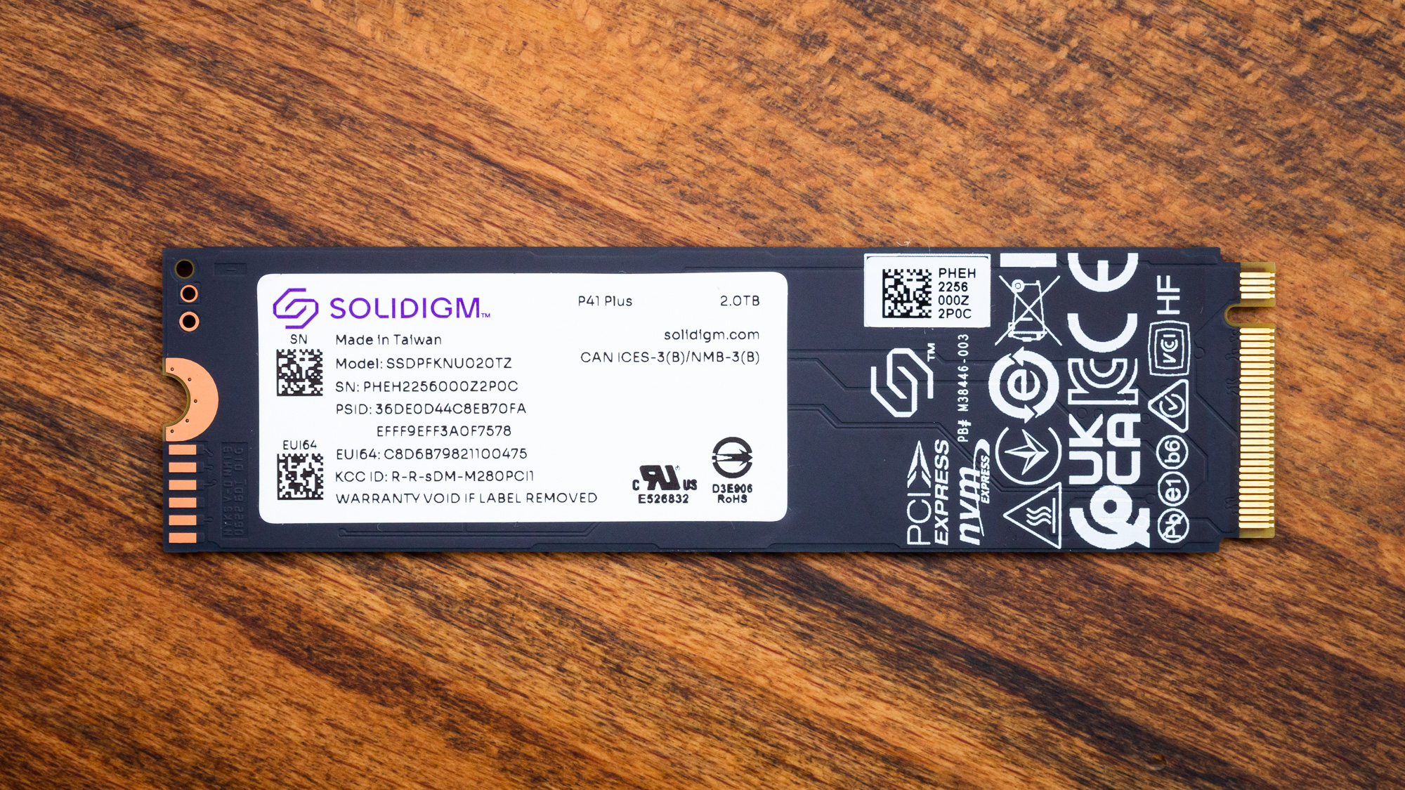 The P41 Plus has a label on the front and the back. The front label displays the subsidiary’s logo and name with the use of an attractive purple hue for a backdrop. The rear label has more information on the drive. It is a single-sided SSD with a controller and just two NAND packages, made possible by using dense QLC.