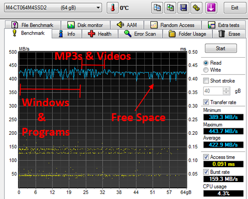 The image above shows how read performance varies. After using Acronis True Image Home to clone our system drive, we set HD Tune to read the entire LBA space sequentially. As you can see, reading back information written to our 60 GB Agility 3 falls between 150-200 MB/s. Once we move on to free space, performance accelerates to 450 MB/s. That's a big difference.