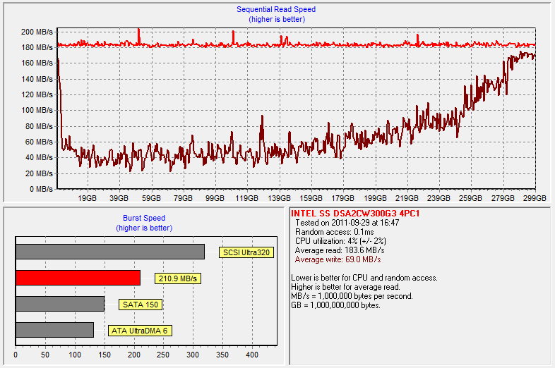 If we combine these results with our endurance test, we see that the 710 handles foreground garbage collection more adeptly, thanks in part to the large amount of over-provisioning. As a whole, this contributes to a minimum sequential write speed of 60 MB/s. In comparison, the 320 relies more on background garbage collection (particularly during reads) in order to recover performance.