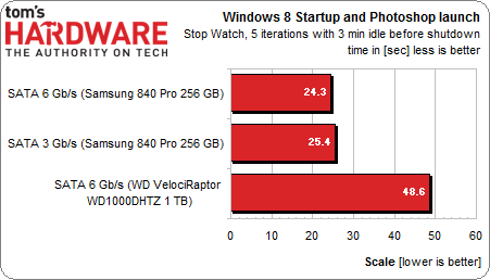 Again, we're looking at a near-draw as Windows 8 boots up, Adobe Photoshop CS6 starts, loads a picture, and then closes. Samsung's 840 Pro takes about a second longer to complete this sequence when we hook it up to a 3 Gb/s port, compared to its 6 Gb/s performance. That's not going to affect your productivity.