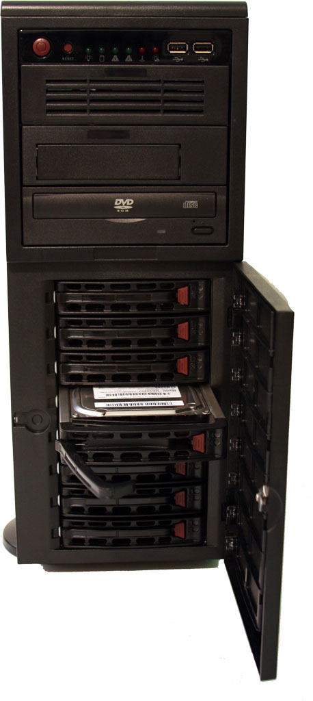 By default, the SC743TQ is able to take up to seven single-slot expansion cards. The Supermicro Super C7X58 motherboard inside offers a total of four slots, though—and one of the expansion slots is consumed by a pre-installed FireWire bracket. Moreover, you’ll notice that the front of the case is set up to accommodate as many as eight hard drives. Because the platform utilizes the SATA storage controller within Intel’s ICH10, however, it’s only able to take advantage of six of the drive bays. Factor in the SATA DVD drive on our test unit and you’re down to a maximum of five drives. If you’d like to use SATA optical drives and maximize the enclosure’s capabilities, you’ll want to step up to an add-in storage controller.
