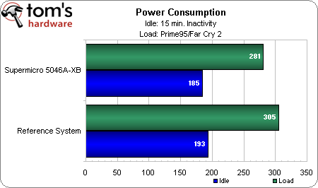 Although the SuperWorkstation is driving three case fans (to the reference system's none), its lower-output, more efficient PSU draws less power from the wall at both idle (with EIST and C1E disabled) and load, demonstrating the very real benefits of picking your power supply carefully and paying attention to its efficiency rating. Even at 281, the power supply load is considered light, so this configuration still has plenty of room to stretch.
