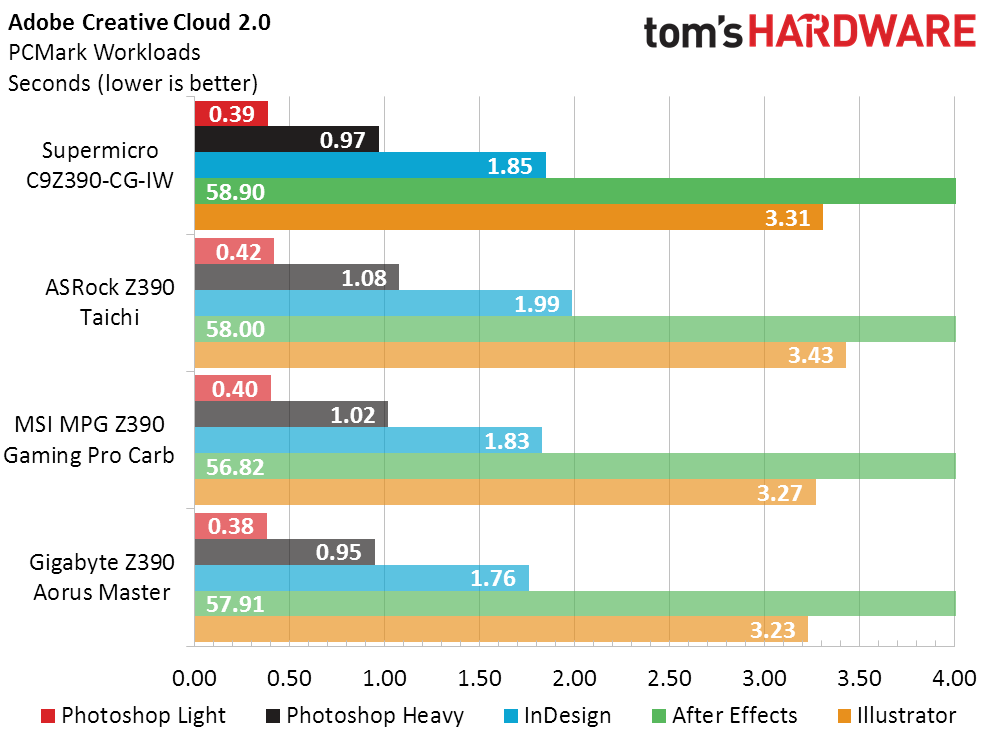 Where less time means more performance, the C9Z390-CG-IW keeps us very close to schedule. However, we did see a 30-millisecond loss in PowerPoint.