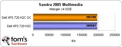 PC Mark 2005 and Sandra 2005 show little performance difference between the factory-overclocked and custom-overclocked settings.
