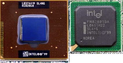 The Intel 850 chipset consists of two chips - the MCH Intel KC82850, produced for the first time here using FC-PGA design methods, and the well-known "southbridge" Intel 82801BA.