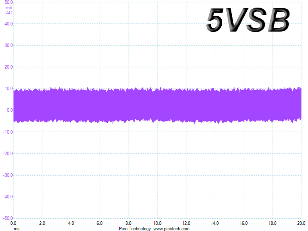 The following oscilloscope screenshots illustrate the AC ripple and noise registered on the main rails (+12V, 5V, 3.3V and 5VSB). The bigger the fluctuations on the screen, the bigger the ripple/noise. We set 0.01 V/Div (each vertical division/box equals 0.01 V) as the standard for all measurements.