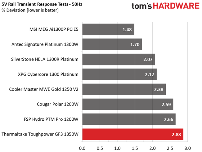 Transient response is satisfactory at 12V, but we would like a lower than 1% deviation on this rail. The minor rails, 5V and 3.3V, have a mediocre transient response.
